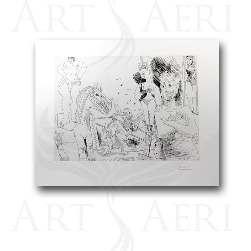 Picasso (Pablo): CIRQUE ET CATCH (B. 1505), Etching, signed in pencil, aside from the edition of 50, on wove paper, with full margins, in good condition, 32 x 41,5 cm (1969).