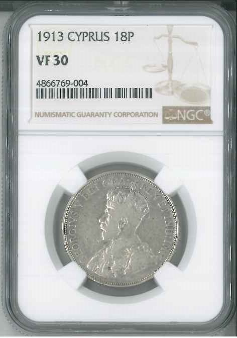 George V Rex (1910 – 1936): CYPRUS 1913, 18 piastres, (0,925 silver) coin, NGC Graded VF 30.