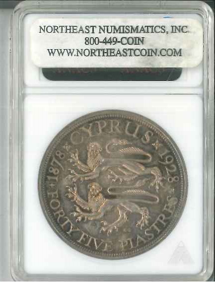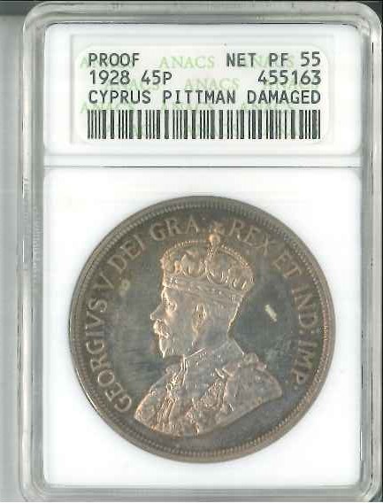 George V Rex (1910 – 1936): CYPRUS 1928, 45 piastres, (0,925 silver) coin, 1/500, Northeast Numismatic Inc Graded Proof 55.