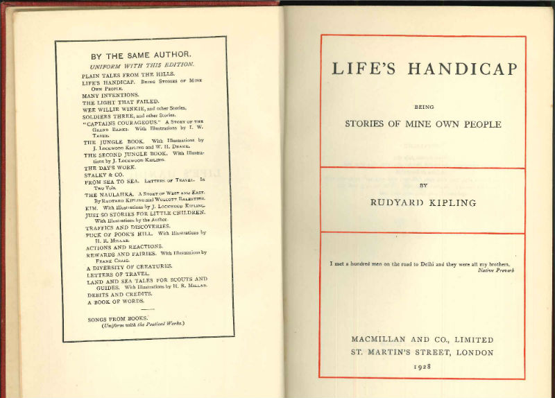 Kipling (Rudyard): LIFE’S HANDICAP, Being stories of mine own people. A fine copy, London (1928).