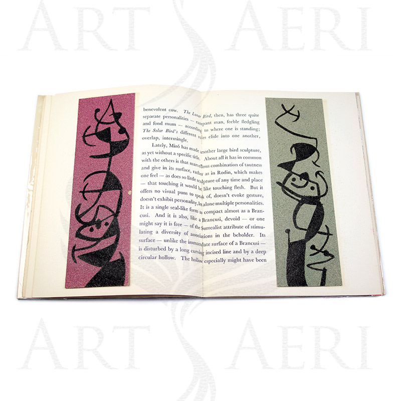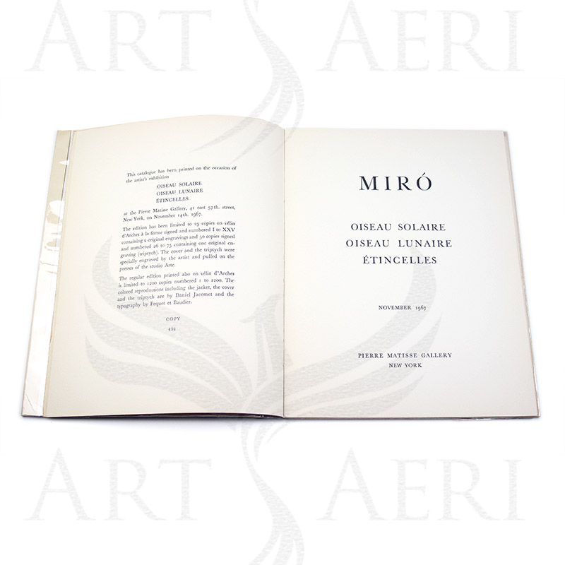 MIRO: OISEAU SOLAIRE, OISEAU LUNAIRE, ETINCELLES, First Edition, dust-jacket, Pierre Matisse Gallery, The Edition printed on Velin d’ Arches is limited to 1200 copies (this one 491). The coloured reproductions including the jacket, the cover and the triptych are by Daniel Jacomet and the typography by Fequet et Baudier, New York (1967).