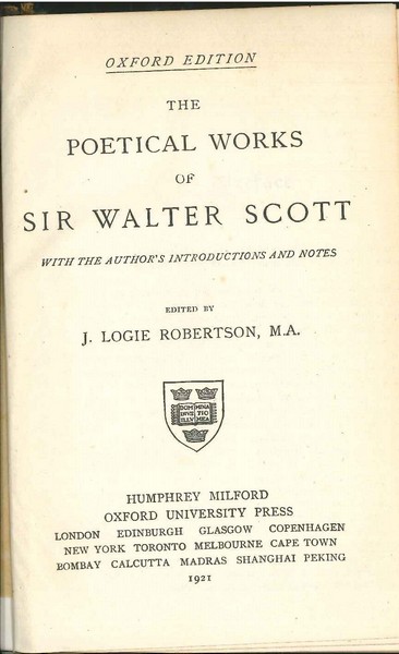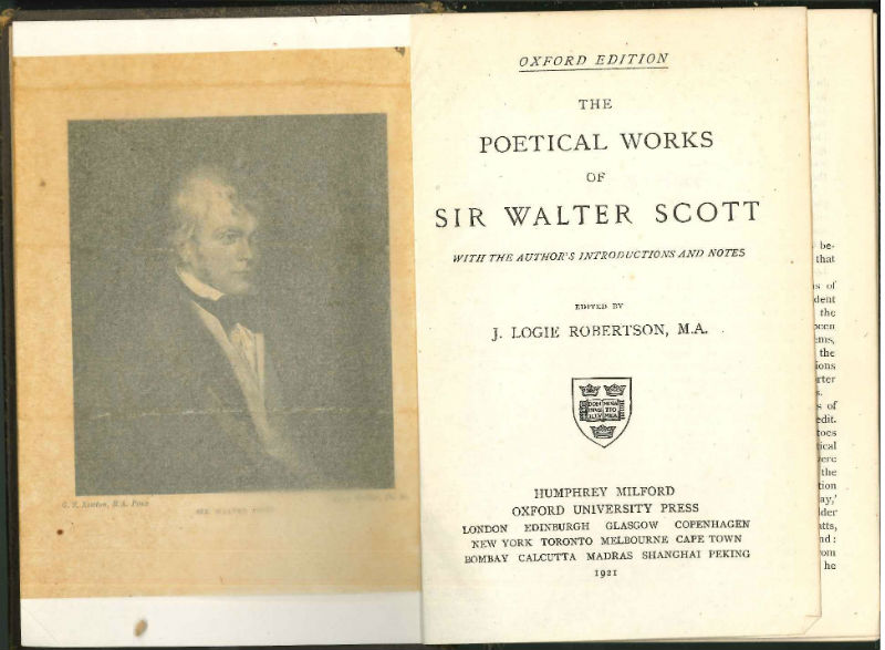 Robertson L.J.: THE POETICAL WORKS OF SIR WALTER SCOTT, First Edition, Frontispiece, Oxford (1921).